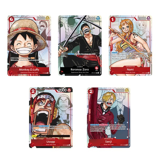 Een selectie van hoogwaardige foil-kaarten met legendarische personages uit One Piece.